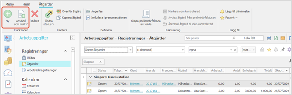 Om du återkommande registrerar liknande typer av åtgärder i olika ärenden är det lättast att göra via mappen Åtgärder, där du ser alla registreringar oberoende av ärende. Du kan t.ex. välja en passande vy och använda datumfiltret i fältet Tidsperiod för att begränsa listan till endast pågående veckas eller månads registreringar.