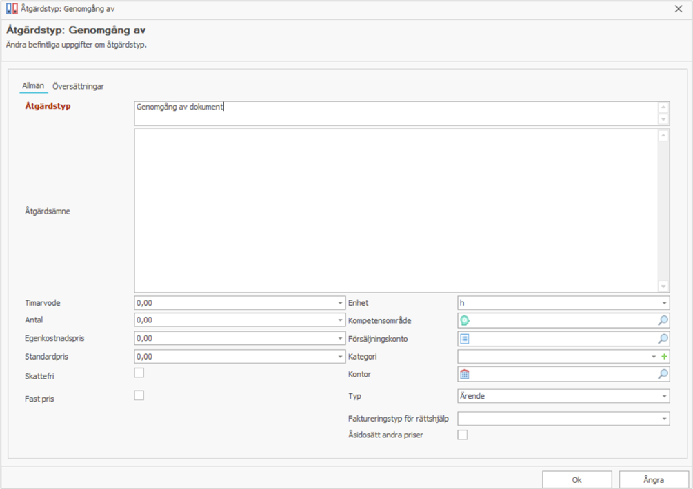 För varje åtgärdstyp kan man ange timarvode och tidsåtgång samt fördefinierad text som sedan fylls i för åtgärder som skapas med den åtgrädstypen och användaren kan redigera i texten enligt behov. En färdig text försnabbar åtgärdsregistrering samt medverkar i att åtgärdstexterna på fakturan är enhetliga.