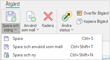 - Spara och stäng-knappen sparar åtgärden och stänger samtidigt åtgärdsfönstret.
