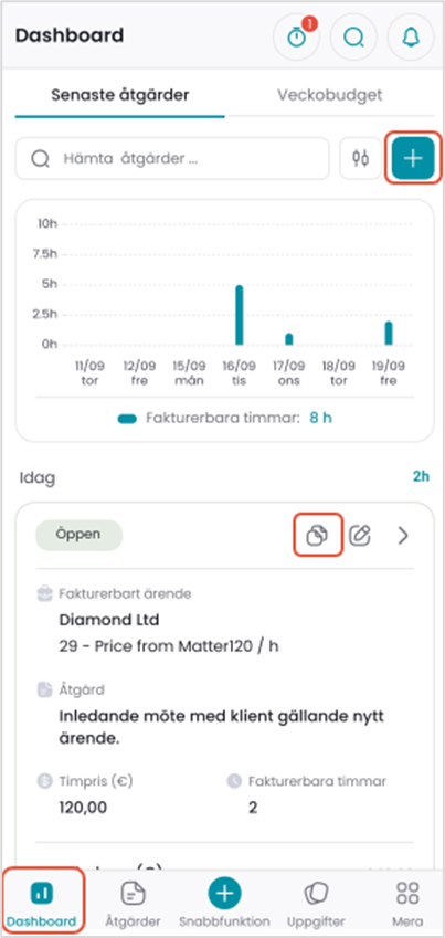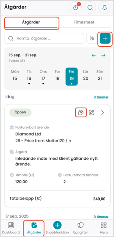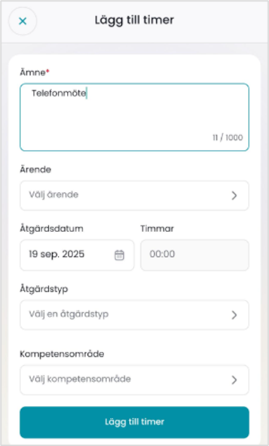 OBS! Via timesheet kan du bara lägga till åtgärder med timbaserad prissättning. Detta innebär att åtgärdstyper med annan enhet än timmar inte kan användas och t.ex. styckeprissatta åtgärder visas inte heller i timesheetens totaler.