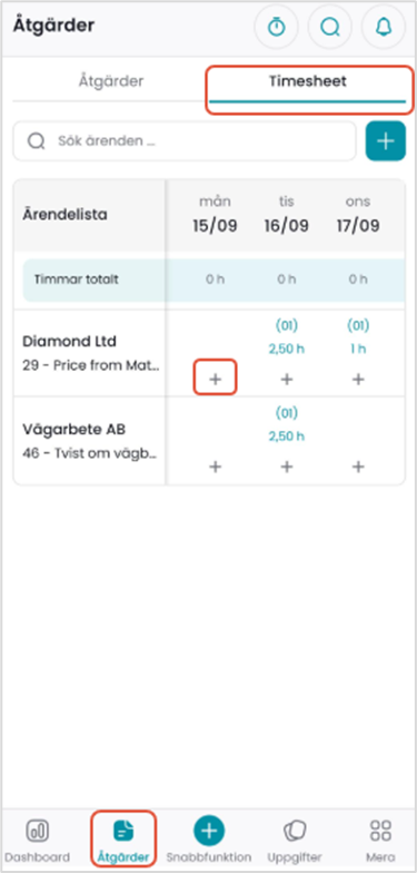 I Timesheet-fliken kan du enkelt lägga till åtgärder till ärenden för valt datum.