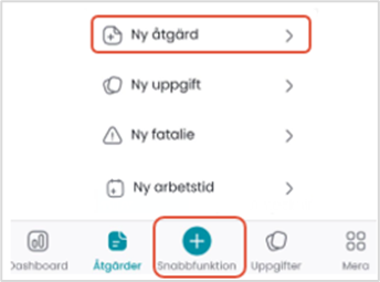 Snabbfunktionen öppnar en meny varifrån du kan skapa en ny åtgärd, Snabbfunktionen är tillgänglig i varje vy i applikationen.