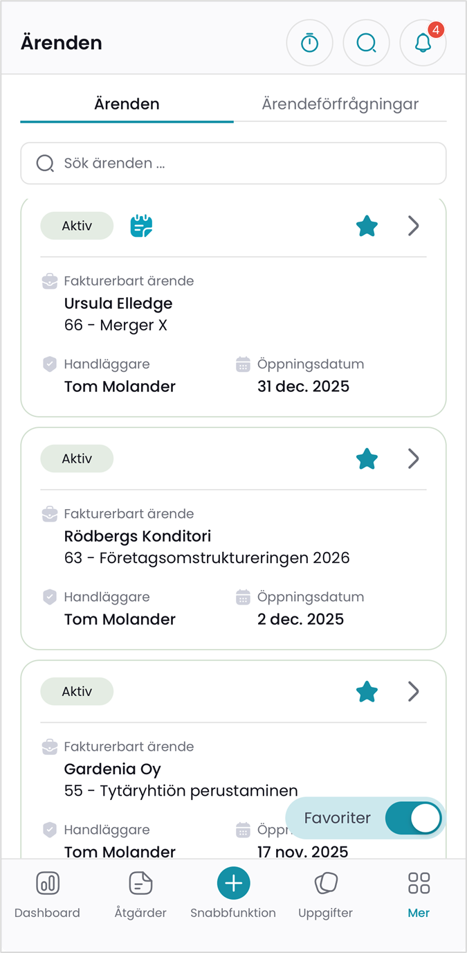 Ärenden-delen bakom Mera-knappen innehåller information om ärenden och möjliggör att söka efter ärenden och se ärendeinformation. Det är inte möjligt att skapa nya ärenden via appen.