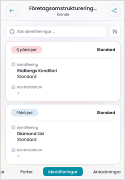 För varje identifieringshändelse visas dess status (ej påbörjad, påbörjad, klar), Identifieringsnivå (förenklad, standard, skärpt, behövs ej), partens namn, senaste datum för kontrollering av identifieringens information.