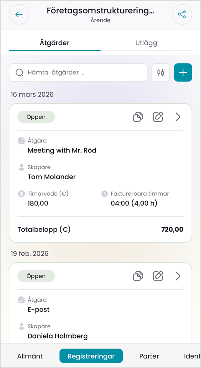 Fliken Registreringar listar alla åtgärder och utlägg som är registrerade på ärendet.
