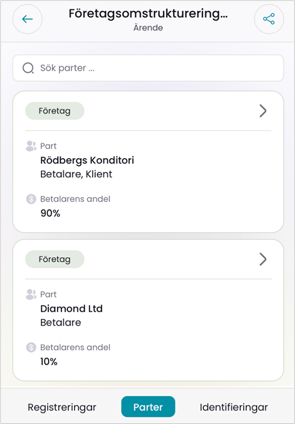 För varje part visas, klienttyp (företag/privatperson), namn, roller inom ärendet och betalningsandel.